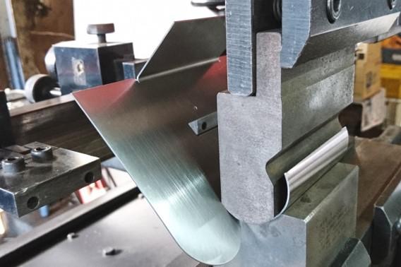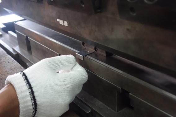 切り出した材料を指定の角度に曲げて行きます。必要に応じてバリ取りやタップ/バーリングも行います。厚板はSS t6迄、SUSはt4.5迄、極小品や多段曲げ等様々な形状に対応致します。